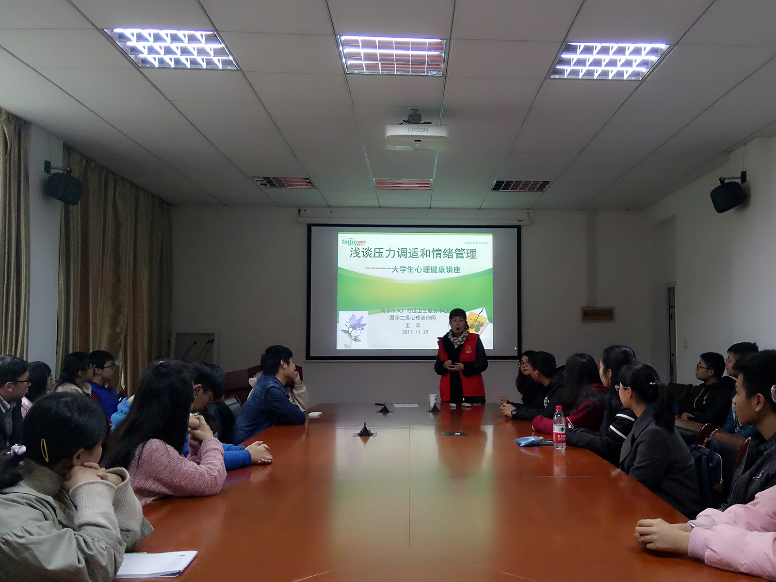 为加强大学生心理健康教育,学院特邀六合区红十字会国家二级心理咨询师王萍老师,于11月29日在北辰楼314会议室对学院16、17级心理委员开展了一次主题为“浅谈压力调适和情绪管理”的心理团体辅导活动。