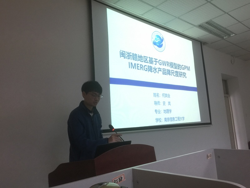 本期沙龙第一位报告人是我院2016级地理学专业何其全同学,导师为史岚副教授,研究方向为GIS气象应用,已向《气象科学》投稿,题目是“中国中东部区域TRMM降水产品降尺度研究及其时空特征分析”,现已录用。本次报告题目为“闽浙赣地区基于GWR模型的GPM IMERG降水产品降尺度研究”。