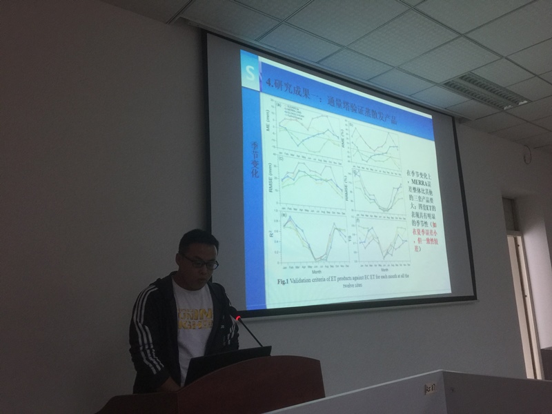 第二位报告人是我院2016级3S集成与气象应用专业的李世杰同学,导师为王国杰教授,主要研究方向是蒸散发产品驱动分析及陆面相互作用,已向《Remote Sensing》投稿,论文题目是“Assessment of Multi-Source Evapotranspiration Products over China using Eddy Covariance Observations”,目前处于外审阶段。报告的题目是“中国地区多源蒸散发产品验证分析及其变化机制研究”。