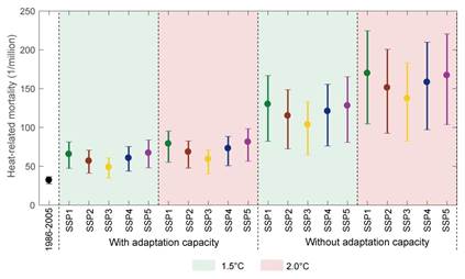 图1 1986-2005年、全球升温1.5℃与2.0℃下,和5种共享社会经济路径下与热有关的死亡率