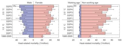 图2 1986-2005年、全球升温1.5℃与2.0℃下,和5种共享社会经济路径下与热有关的分性别(a)与年龄(b)的死亡率对比(图中的柱和直线表示多模式预估的均值和变化范围)