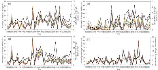 图1 1984-2017年八种潜在蒸散发方法估算的干旱面积与观测干旱受灾面积对比