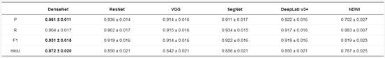 而对于DenseNetResNetVGGSegNetDeepLab v3+深度卷积神经网络,从模型的训练效率上看,DenseNet的训练效率最优,但是训练时间上来看DeepLab v3+的结果要略优于DenseNet。从模型的水体识别效果上来看,DenseNet的总体识别精度最优,但是它在对区分云和水体的时候存在一定的误判情况。相较于其他四种深度神经网络,DenseNet网络在水体识别方面精度更高,本研究中达到96%以上;且对细部特征也有良好的识别能力,展示了在遥感地物识别方面的广阔应用前景。