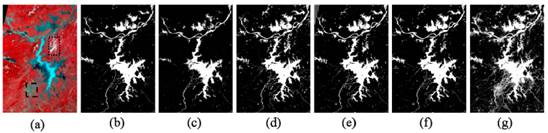 2. 不同模型在2016729日鄱阳湖地区遥感影像的水体识别效果对比。(a)假彩色遥感影像,(bDenseNet,(cResNet,(dVGG,(eSegNet,(fDeepLab,(gNDWI模型识别结果。白色区域为识别出的水体区域。