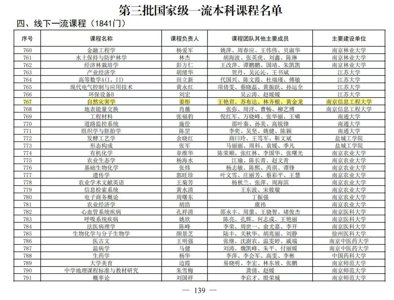 近日,教育部公布第三批国家级一流本科课程认定结果,我院姜彤教授领衔的教学团队课程《自然灾害学》(线下课程)成功入选国家级一流本科课程!该教学团队还包括王艳君教授、苏布达教授、林齐根副教授和黄金龙博士。据悉,教育部共认定5994门课程为第三批国家级一流本科课程,其中,线下课程1841门。