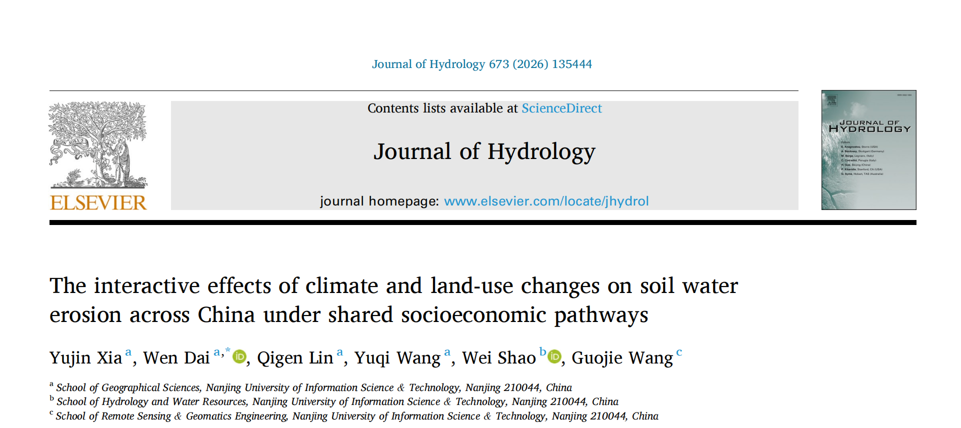 Xia, Y., Dai, W., Lin, Q., Wang, Y., Shao, W., Wang, G., 2026. The interactive effects of climate and land-use changes on soil water erosion across China under shared socioeconomic pathways. Journal of hydrology, 673, 135444. https://doi.org/10.1016/j.jhydrol.2026.135444.