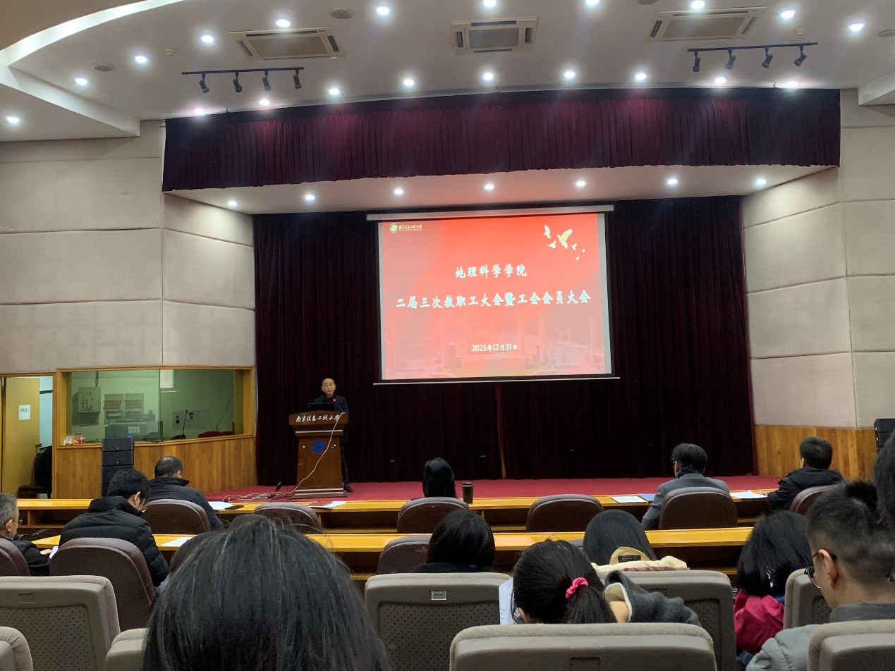 12月31日下午,地科院第二届第三次教职工大会暨工会会员大会在长望楼报告厅召开,学院全体领导班子成员和教职员工参加会议。会议由学院党委副书记兼副院长、分工会主席王平主持。 院长陈爽作学院2025年工作报告。她表示2025年是“十四五”规划的收官之年,学院紧紧围绕学校发展战略,以地理学学科建设为主线,以一流专业验收和博士点申报为核心任务,全体教职员工齐心协力、攻坚克难,推动了师资队伍、学科建设、人才培养、科研工作、教学和专业建设、国际化、学生培养、实验平台建设等方面各项事业的显著进步。她还就下一步学院发展和2026年学院重点任务进行了布置,希望全院教职工以更加饱满的热情,更加扎实的工作,推动学院各项事业再上新台阶。同时,院办主任熊蒙对2025年学院财务收支情况进行了汇报。 院党委书记殷跃峰对学院2025年奖励性绩效工资分配方案做解读,就学校政策变化和教师们普遍关注的问题进行了详细分析和解释。会议表决通过了方案。 王平作学院分工会工作报告,并汇报2025年学院分工会经费使用情况。 最后,殷跃峰就学院作风建设、师德师风建设、统战工作、保密工作等提出要求。他结合学院考核工作希望全体教职工进一步提高强党建、重教学、抓科研意识,将学校学院发展和个人成长有机结合,在助力学校学院高质量发展中增强个人成就感、获得感。 本次大会的召开,全面总结了学院过去一年取得的成绩,也为学院未来的发展明确了方向,学院全体教职工将以本次大会为起点,开启为学院高质量发展而努力奋斗的新征程。